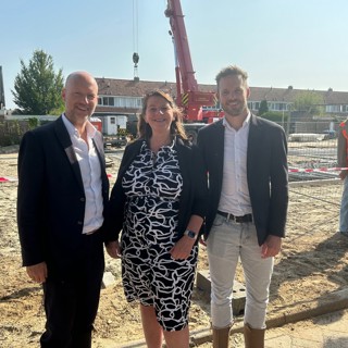 Op de bouwplaats aan de Molenweg in Zutphen vierden we een feestje. We vierden namelijk de start van de bouw van 54 nieuwe woningen aan de Molenweg en de Baankstraat, in de wijk de Hoven in Zutphen. De werkzaamheden zijn inmiddels in volle gang, maar we wilden deze bijzondere gebeurtenis niet zomaar aan ons voorbij laten gaan. Één van de terugkeerders is mevrouw van Zeeventer. Zij wilde graag terug omdat ze hier heel fijn woont. Ze woont hier al haar hele leven en is de langstwonende bewoner van deze wijk. Dat is natuurlijk heel bijzonder en we vroegen haar of zij samen met de wethouder van de Gemeente Zutphen en bouwbedrijf Plegt-Vos iets bijzonders wilde doen. Hiervoor werden natuurlijk de nodige veiligheidsmaatregelen genomen. Onder begeleiding van de collega’s van Plegt-Vos legden mevrouw van Zeeventer en Jasper Bloem symbolisch een vloerplaat.